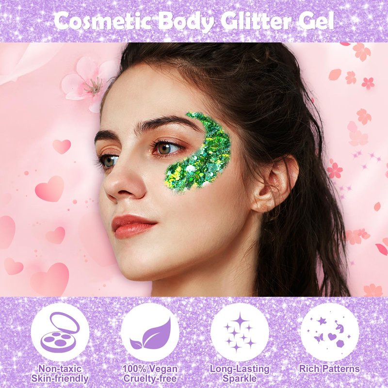 - 【Premium Cosmetic Glitter Gel】 This mardi gras glitter gel is high-quality chunky glitter, it's skin-friendly and cruelty-free, ensuring a comfortable and enjoyable experience. this makeup glitter can be used for sparkling to your hair, create unique glitter face makeup, or embellish your eye makeup. Moreover, our slime glitter is safe to use for body makeup, including nails, chest, neck, shoulders, and legs. You can sparkle and shine without worrying about harmful effects on your body.