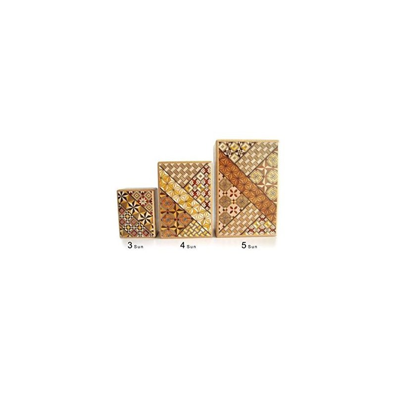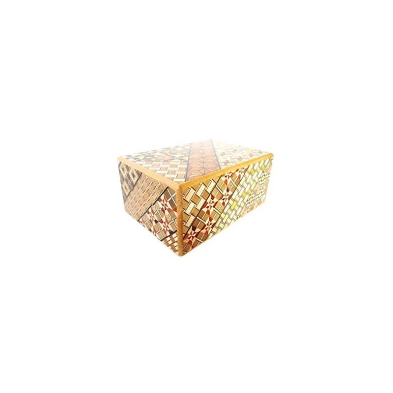 Yosegi Puzzle Box 4 sun - 7 steps - This Japanese Secret / Puzzle Box is made in the Yosegi pattern. This pattern is the original traditional design used for puzzle boxes. Every box is a little different in design depending upon how the pieces are applied. Each Japanese puzzle box is individually handcrafted using techniques passed down through the generations since the Edo Period and imported directly from the artists in Hakone Japan. Dimensions: 4.7 x 3.2 x 2.2 inches
