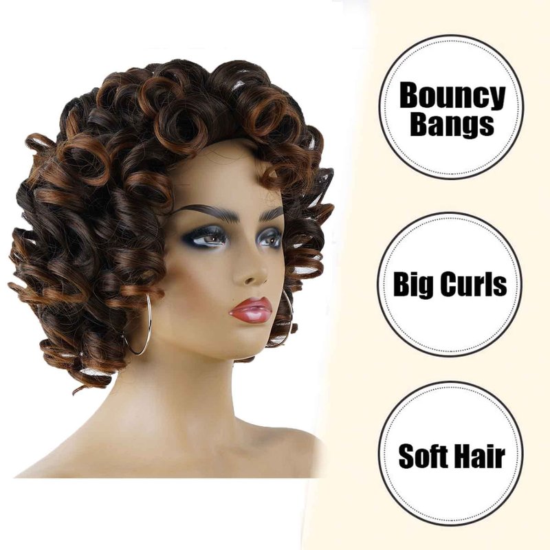 - ♥Hair Color:Black to Brown Highlights short big curly wigs for black women, no matter what color your skin is, this short curly wig with bangs will match your skin tone perfectly, just like healthy natural hair does