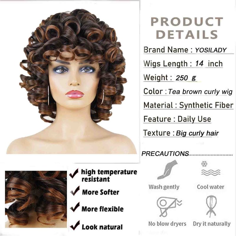YOSILADY Brown Curly Wigs for Black Women Short Curly Wig with Bangs Soft Loose Curly Wigs for Women Synthetic Fiber Glueless Hair for Daily (Brown)