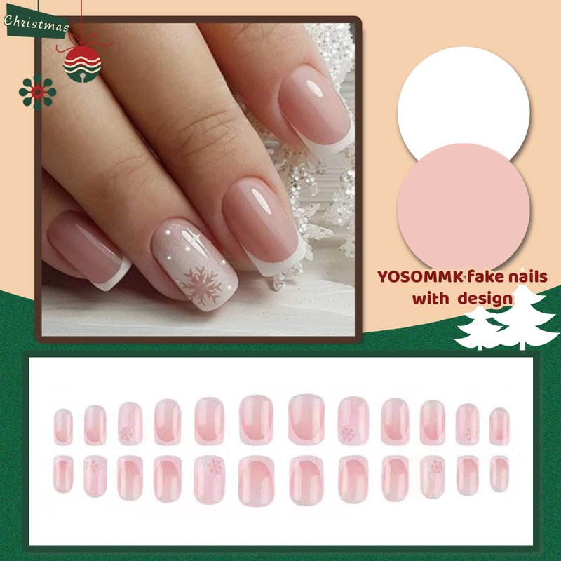 YOSOMMK French Tip Press on Nails Short Square Fake Nails with Snowflake Designs Nude Glossy Glue on Nails Christmas Acrylic Full Cover False Nails for Women and Girls