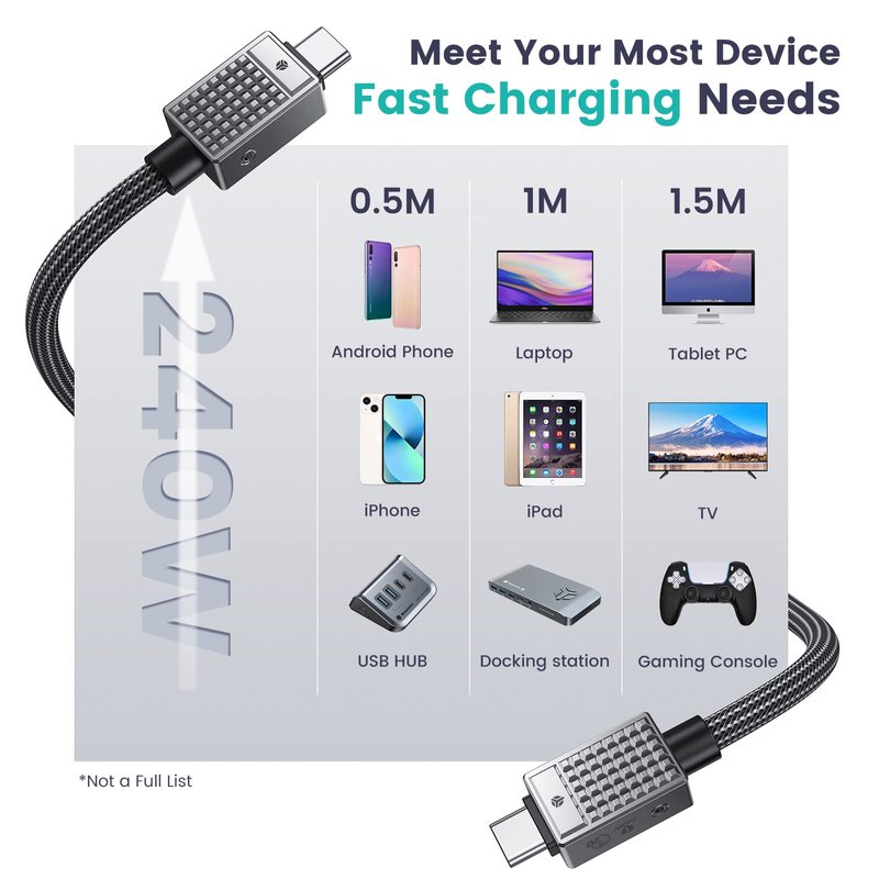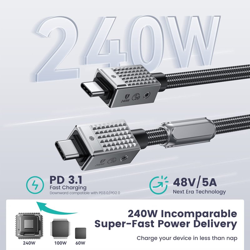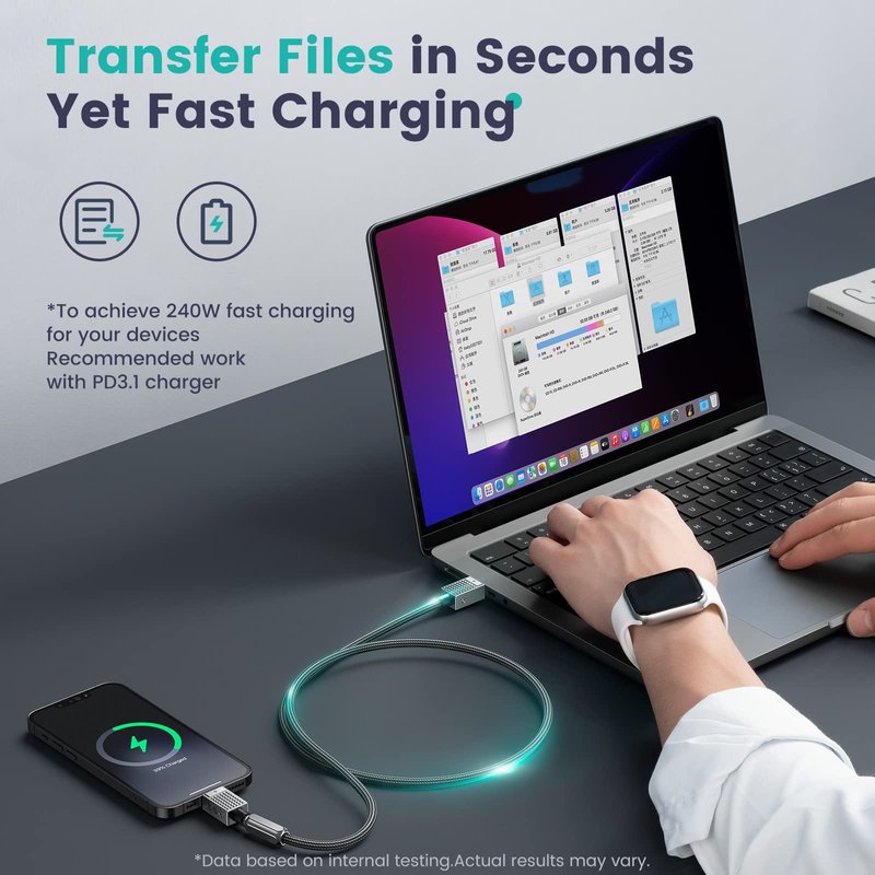 - 20Gbps High-Speed Data Transfer: The type c charging cable supports lightning-fast data transfer speeds of up to 20Gbps. Whether you're transferring large files, streaming high-resolution videos, or syncing your devices, this 240w usb c cable will meet your demands for speed and reliability. You don't have to worry about running out of power and spoiling the fun while gaming. And don't worry about buying extra cables to transfer data. Please use a C port adapter with the appropriate power.