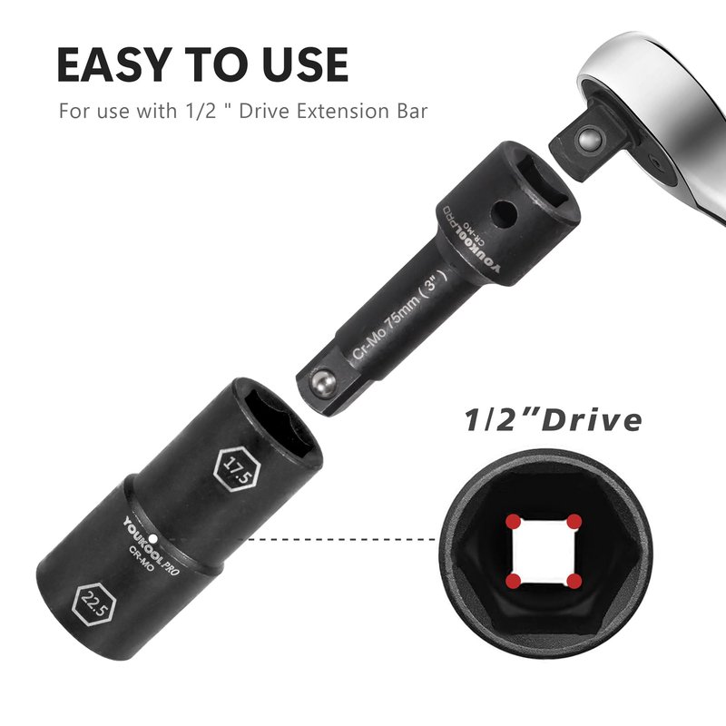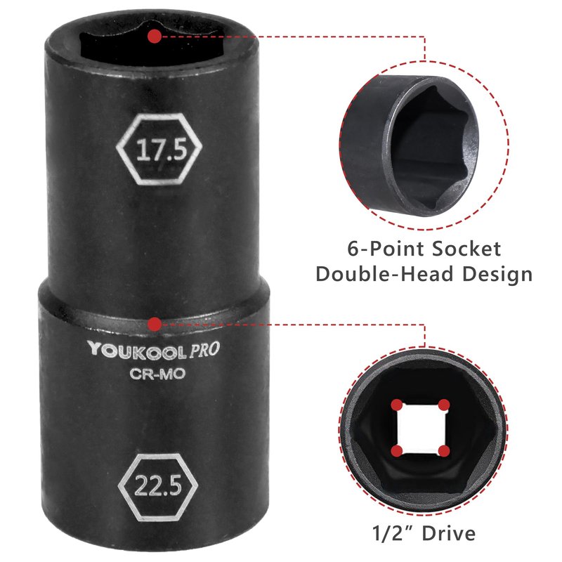 - Efficient Dual-Size Socket - Our innovative 1/2-inch drive socket combines two sizes in one tool, fitting both 17.5mm and 22.5mm fasteners. It's the perfect blend of convenience and versatility.