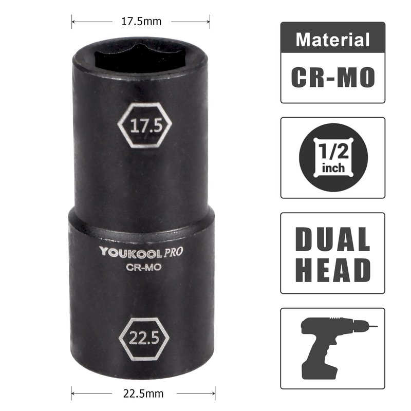 YOUKOOL 1/2-Inch Drive Double Ended Impact Socket, 17.5mm x 22.5mm, 6-Point,Thin Wall Wheel Protector Nut Socket, Made from Robust and Anti-Corrosive Steel, Precise Laser-Etched Size Markings