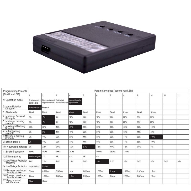 - 【Use for】:The program card is used to program the brushless ESC for25A 35A 45A 60A 80A 120A ESC. Max. Brake force: 50%, 25%, 75%, 100% (25A, 35A, 45A, 60A).25%, 50%, 75%, 100% (80A, 120A). Max. Reverse force: 25%, 50%, 75%, 100%. Neutral range: 9%, 6%, 12% work state
