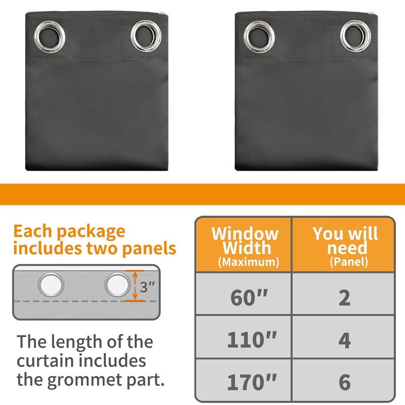 - The package includes set of 2 dark grey blackout curtains; Each panel measures 42 Inch wide by 63 Inch long.