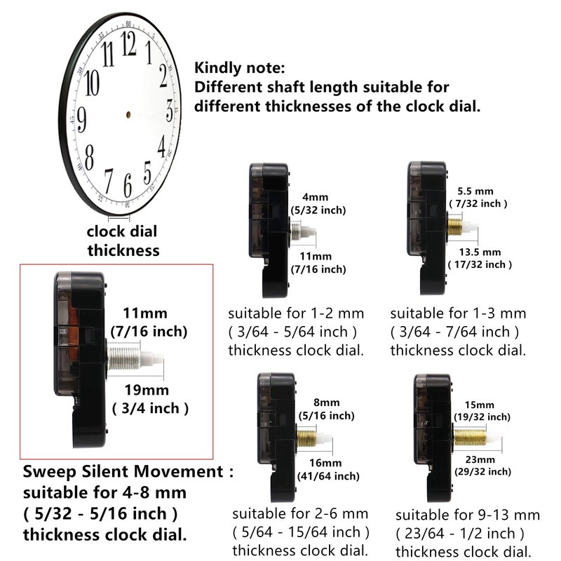 - Choose the right clock mechanism: total shaft length is 19 mm (3/4 inch),thread length is 11 cm (7/16 inch); suitable for 4-8 mm ( 5/32 - 5/16 inch )thickness clock panel.