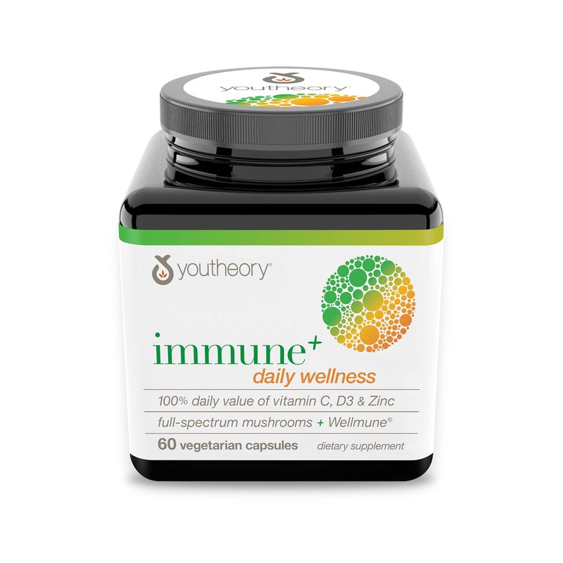 - YOUTHEORY IMMUNE+ DAILY WELLNESS: Harnesses the power of medicinal mushrooms and clinically studied Wellmune, to help strengthen the body’s immune response. Incorporated essential nutrients - Vitamin C, Vitamin D3 and Zinc - to support the maintenance of a naturally robust immune defense system.