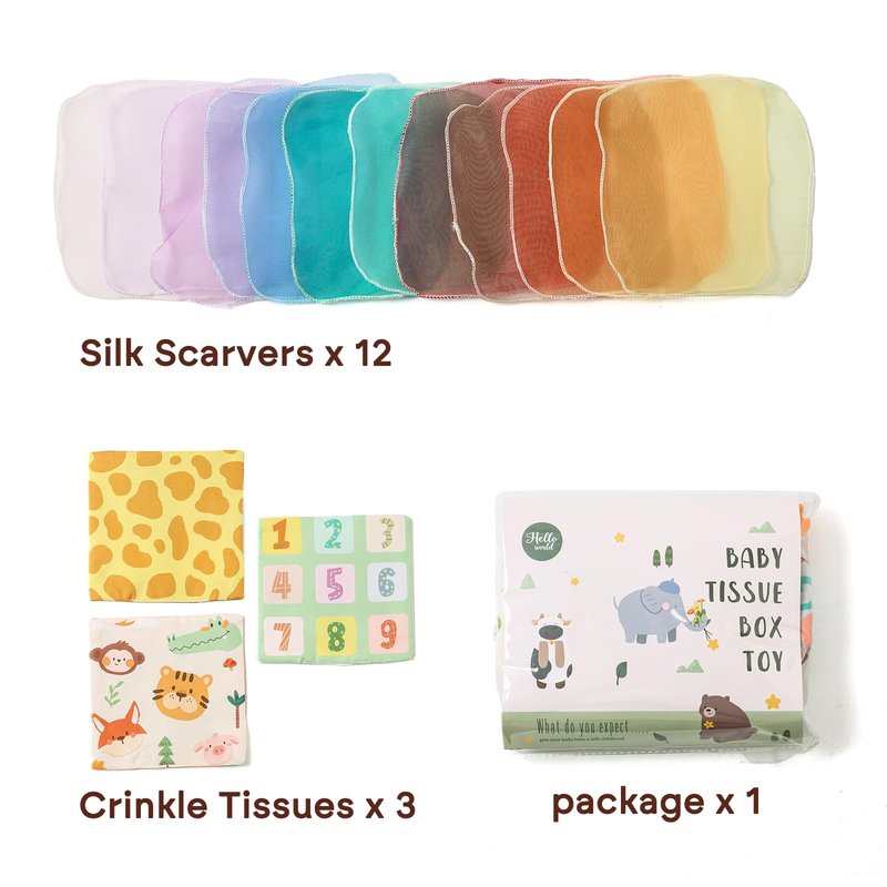 - PERFECT TISSUE BOX TOY: This tissue box toy includes A soft tissue box, 3 types of tissues with sounds, and 12 silk scarves. The silk scarves and tissues are very soft and can be tied together for easy pulling. This set will attract your baby and grow with them