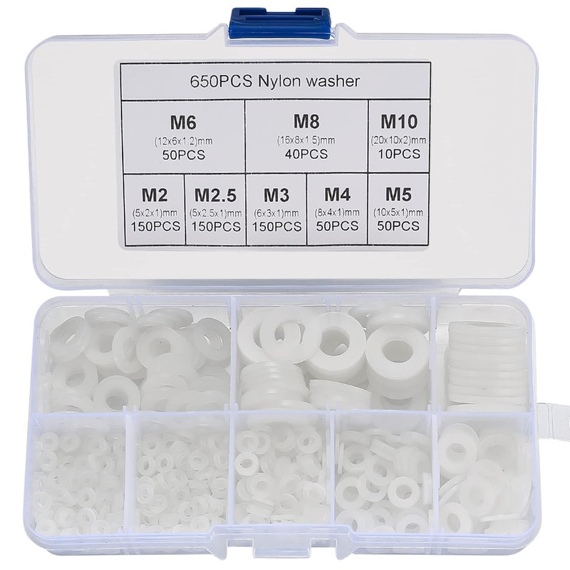 - You will receive a total of 650 pcs white flat nylon wahsers, in the size of M2/M2.5/M3/M4/M5/M6/M8/M10.