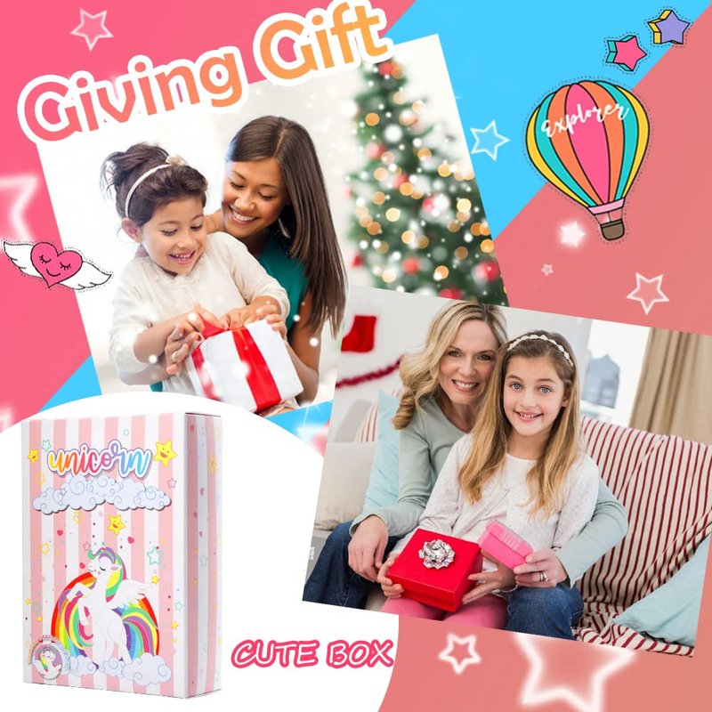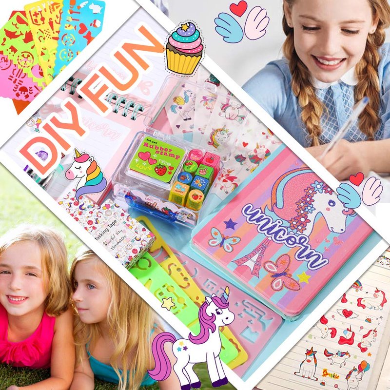 - 🌈【Unicorn Dairy Set for Girls】 Come with unicorn notebook (60 pages), 6 coloring pens, 8 stampers and 4-colors ink pad, 4 drawing stencils (60+design), 1 sticker roll and 6 sheets unicorn stickers. Great Birthday gift, halloween/christmas gift, school supplies for kids.