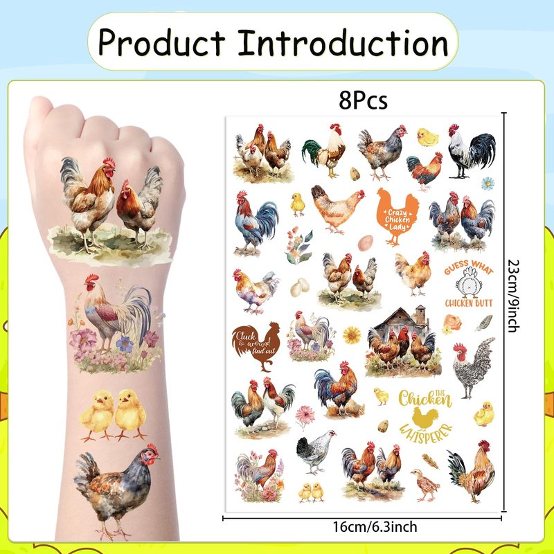 - FUNNY TATTOO GIFTS: You'll receive eight tattoos, each measuring 9 x 6.3 inches, featuring hens, chicks, roosters, chicken coops, ‘Crazy Chicken Lady’ and more, which will definitely give your party personality!