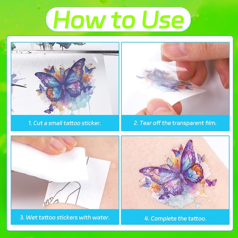 - How to Use: Frog party temporary tattoo stickers are very easy to use. All you need to do is cut out the desired design on the tattoo sticker, stick it on the area where it needs to be attached, and then wet it with a damp cloth or water-soaked sponge, for example. Just wait a few seconds and a perfect temporary tattoo is done. You can also remove it easily with soap or water.