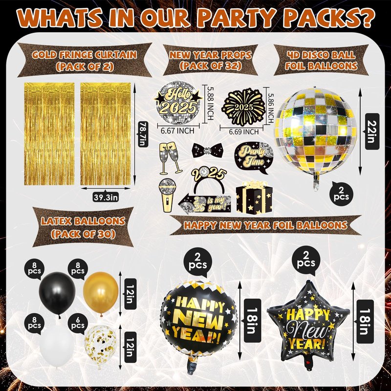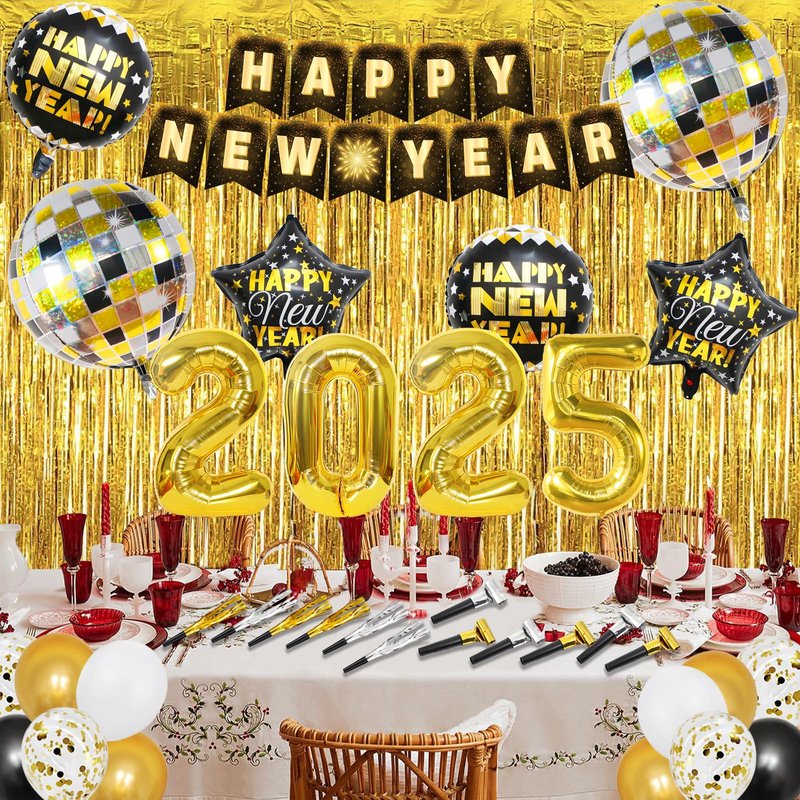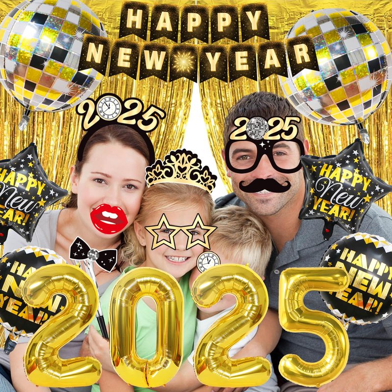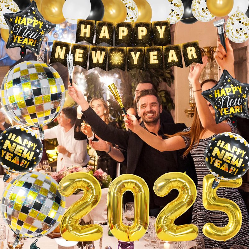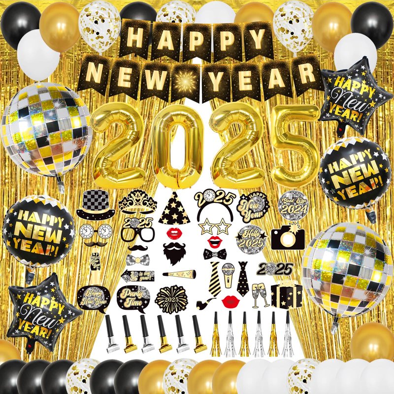 - NEW YEAR EVENT SUPPLIES: Included 1×2025 new year banner, 32×disco photo props, 12×noise makers (6×gold, 6×silver, two styles), 1×2025 number foil balloon, 2×giant disco foil balloon, 2×18 inch round Happy New Year foil balloon, 2×18 inch star-shaped Happy New Year foil balloon, 30×latex balloons (8×black balloons, 8×gold balloons, 8×white balloons, 6×clear with gold confetti), 2×gold foil fringe, enough to decorate and support a great New Year's Eve party