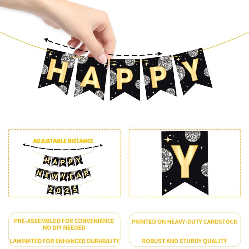 - CLASSIC AND ELEGANT BLACK AND GOLD TONE: Elevate your New Year Eve party with this classic "Happy New Year" banner. The sophisticated black and gold color scheme, complemented by silver disco balls, adds a touch of refinement, creating a stylish and festive atmosphere. Whether hung in any room, this banner perfectly blends with your 2025 New Year decorations, making your celebration unique and memorable