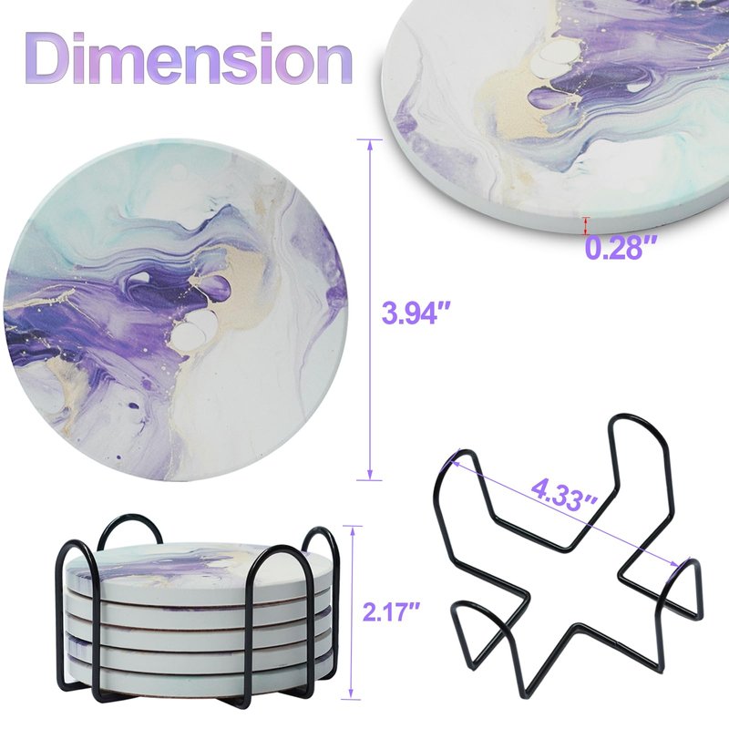 - Package Included: A set consisting of 6 4 "round ceramic marble coasters and a 4.5" black metal coaster holder.