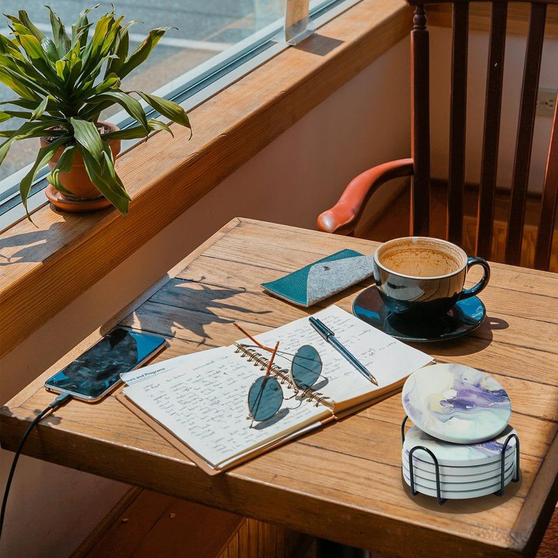 - Convenient Storage: When coasters are not in use, you can put them on a black metal stand to keep your desk clean.