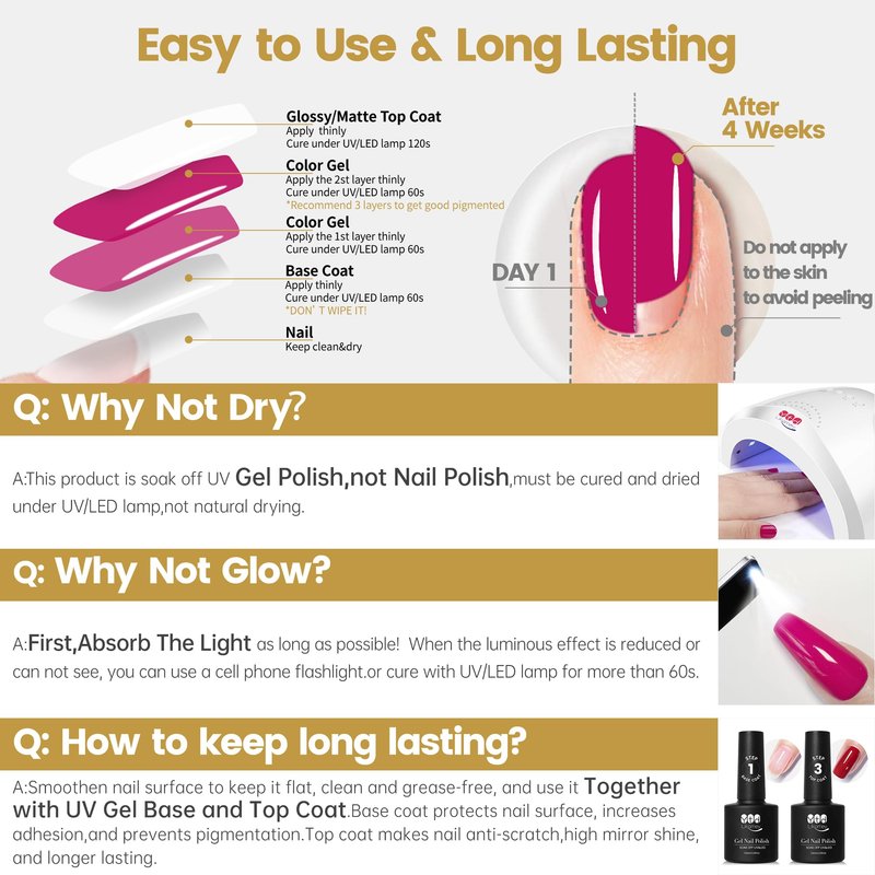 - 👻➍【IMPORTANT TIPS FOR USE】In rare cases gel polish may cause an allergic reaction by skin contact.Please test before using it to check for any reaction.Clean and polish the nail surface before use to keep it dry and flat,gel polish must be cured and dried under UV/LED lamp and needs to be used with gel base and top coat,curing time for each step is 60-120 seconds.For detailed operation,please refer to the product manual.