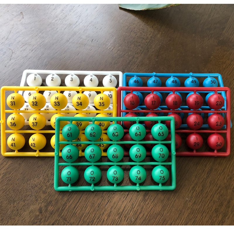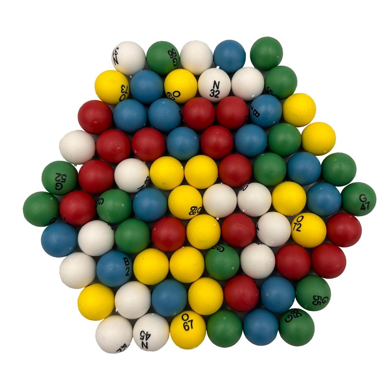 These bingo balls come in 5 bright colors: blue, red, white,green, and yellow.