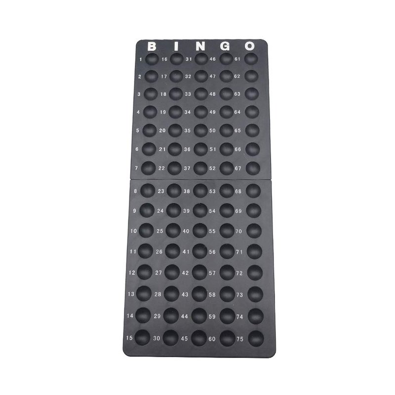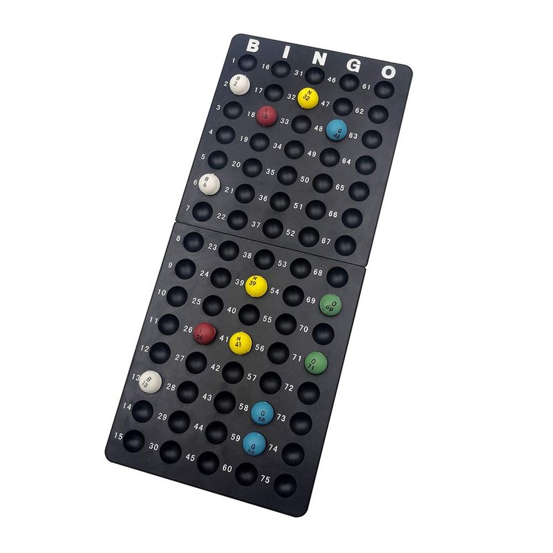 - Holds a total of 75 balls. Easy to place bingo balls on the bingo board, the main board is black to contrast with the balls. Lettering on the board is clear and easy to read.Bingo callers can effortlessly call and track their bingo numbers with this bingo board.