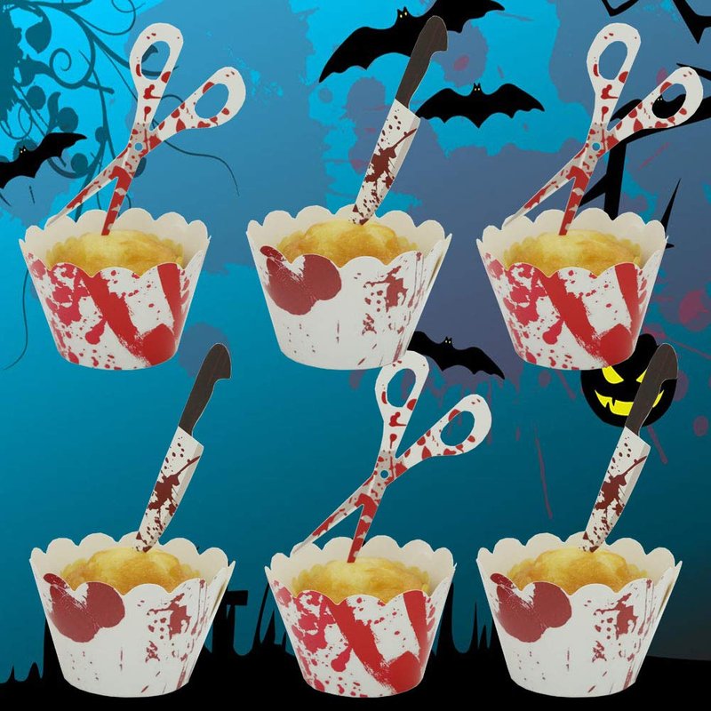 YuBoBo Halloween Cupcake Toppers Wrappers, Horror Cake Halloween Decoration Bloodstain Cake Knife Scissors Food Decor Party Supplies (12 sets (24pcs))