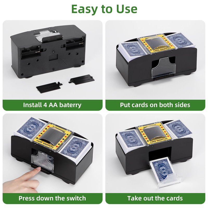 - 【Automatic & Electric Battery Operated】 Yuccen automatic card shuffler is powered by 4 AA batteries(Not Included).Battery powered,shuffle fast,only takes seconds to shuffle up 1-2 decks,easy for both elderly,young people,children to use.Our card shuffler can free your hands and save your time,more time to have fun of playing card games
