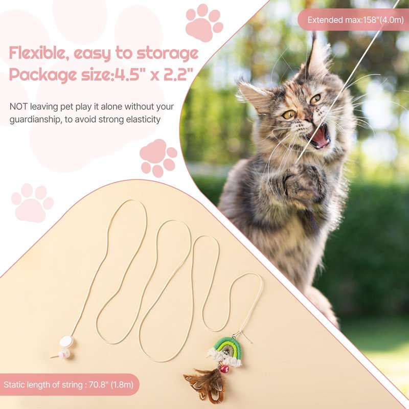 - 【Adjustable and durable】The elastic rope of this hanging cat toy extends from 10" to 70.8" (1.8m) and is made of thick, abrasion-resistant material. And you can adjust the length through the fixed botton. Your cats will flip, jump, pounce, chase like a wild animal with this teaser toy. Even if your cat bites off the rope, you can still tie it back on for longer life.