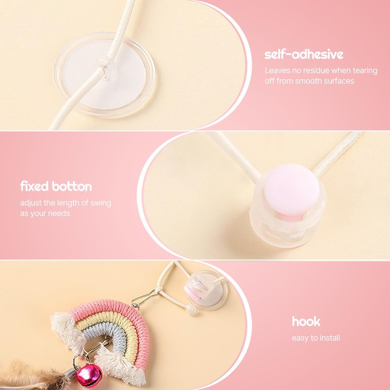 - 【Entertainments for indoor cats】This self-adhesive hanging cat toy combines retractable string and feather, cat's hunting instincts irresistiblly . Swinging the feathers like a bird will make your cats run and jump.