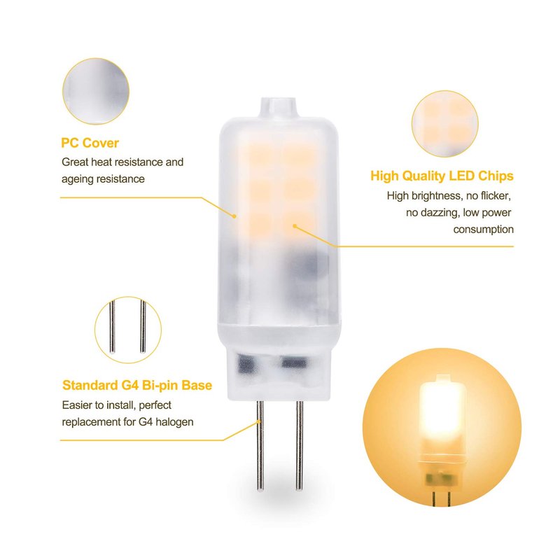 - 【HIGH PERFORMANCE】AC/DC 12V 2W g4 LED bulb, Omni-directional 360 degree beam angle, soft white 2700k gives off warm white light without flickering or buzzing. Anti-pressure, heat and impact resistant