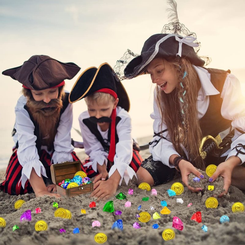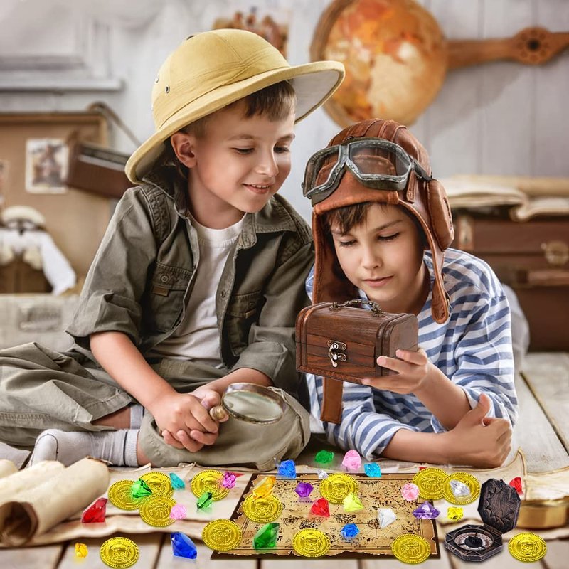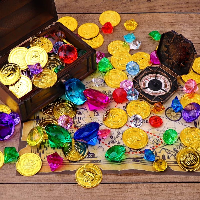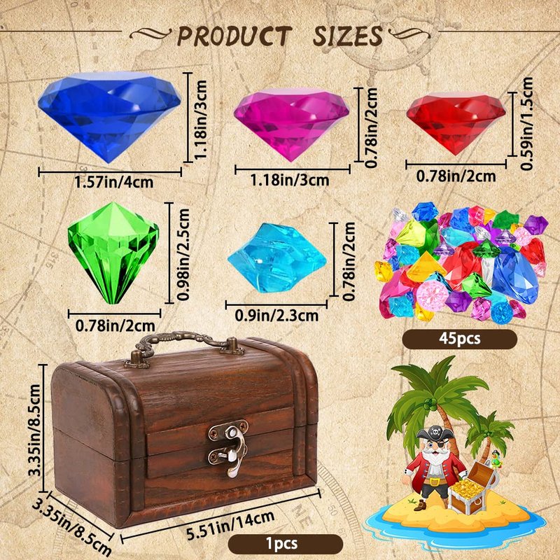 - What you will get: You will get 63 pieces pirate treasure chest set, It includes 45 pieces of diamonds, a vintage pirate treasure box, a compass, a pirate map, and 15 pieces of plastic gold coins.with vintage colors and classic design.It's a great choice for pirate treasure hunting.The children will love it.