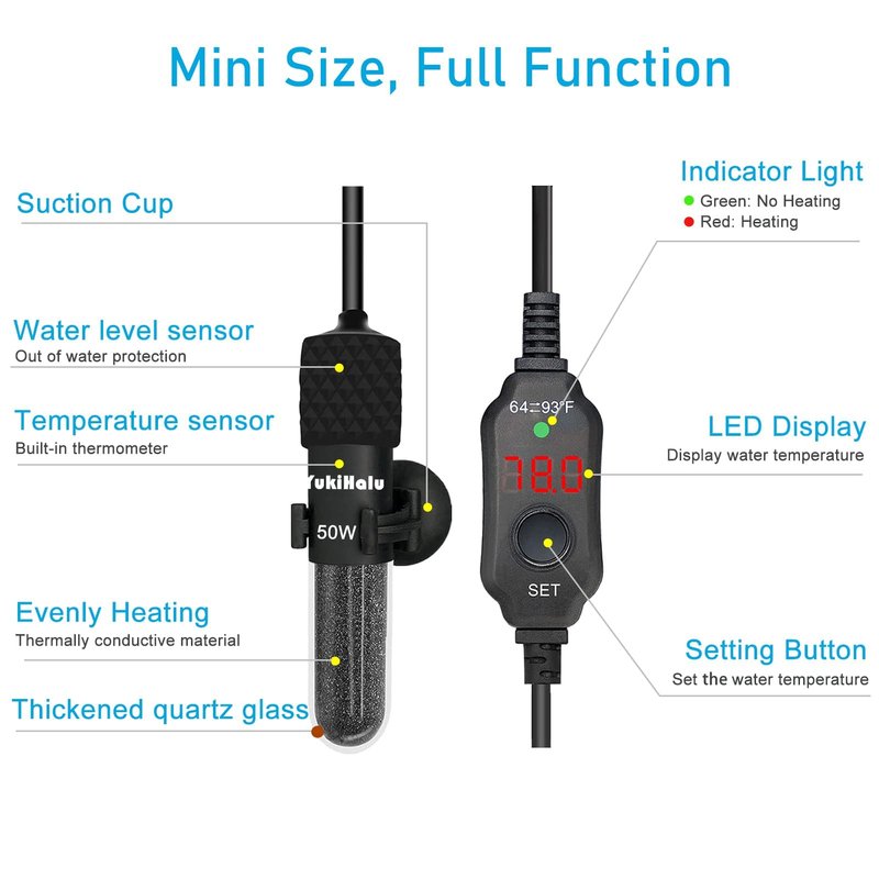- 【Super Mini Size, 25Watt for 1-5 Gallons】 YukiHalu 25W aquarium heater is designed for 1-5 gallons mini fish tank. Compact design, take less space in the fish tank, easy to hide in the tank. Temperature can be accurately adjusted from 64 to 93°F. This heater suitable for both saltwater and freshwater. The rated voltage is 100-130V.