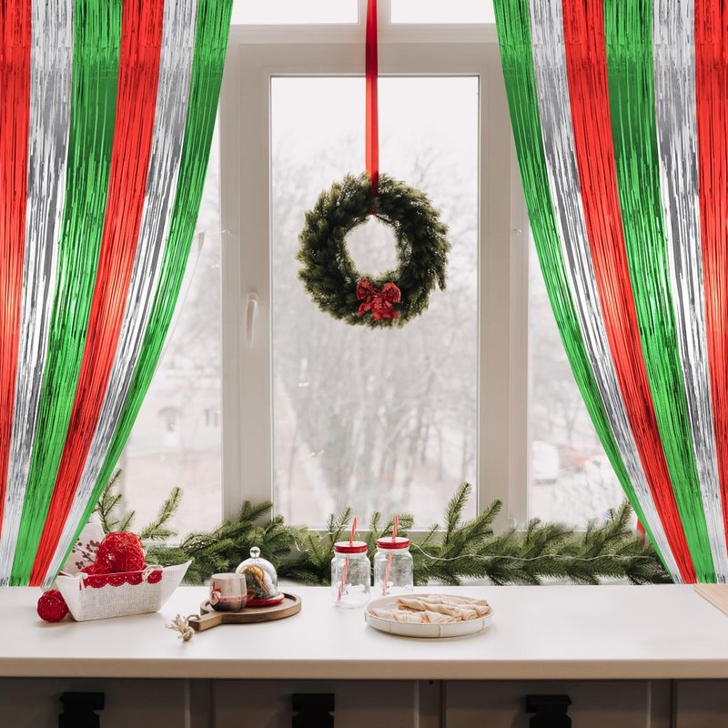 - ๐Widely Applications๐ : These red green silver foil fringe curtains backdrop are a wonderful finishing touch for any party such as a christmas carnival party, new year's eve party, friendsmas party, ugly sweater party, birthday party, anniversary party, wedding party, engagement party, graduation party decorations, they are also suitable for photo backdrop, stage background, disco, baby shower, bridal shower, etc.