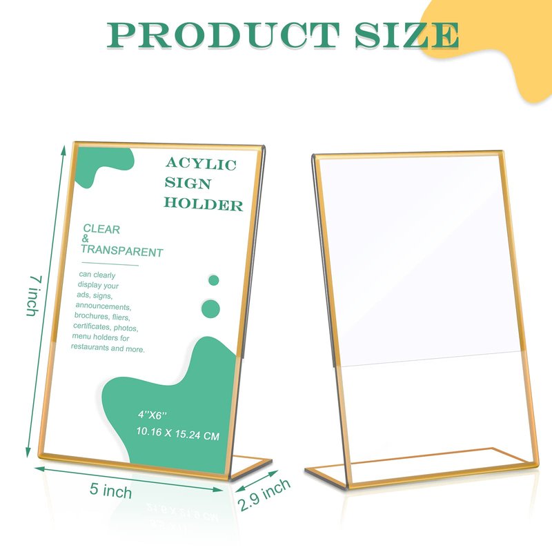 - Standard Size and 12 Pack: this package contains 12 pieces of 4 x 6 inch gold table sign holders; Each clear sign holder has an opening on its side for easy paper insertion, 4 x 6 inch sized paper works can nicely fit; Note: please remove the protective film before use for a clearer display