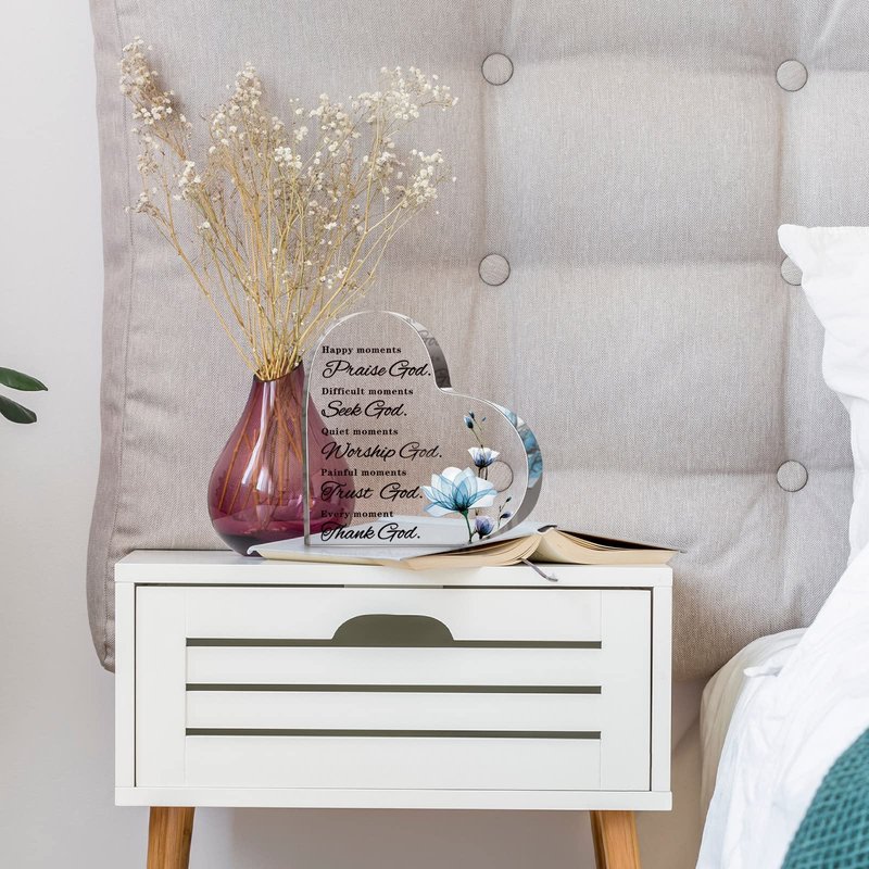 Features: Reliable Material: The bible verses decor is made of quality transparent acrylic, which is hand cut to make it look elegant, impact resistant, clear printing and will not fade, serviceable and not easy to break, it can be stored for a long time Multiple Applications: The rustic Christian decor is a cute and delicate decoration for your table, shelf, fireplace and other places, leaving beautiful memories and not taking up much space. Specifications: Color: as pictures shown Material: acrylic Size: about 15.12 x 15.12 x 1.4 cm/ 5.9 x 5.9 x 0.55 inches Package includes: 1 x Bible verses decor Warm notice: Manual measurement, please allow slight errors in size. The colors may exist slight differences due to different screen.