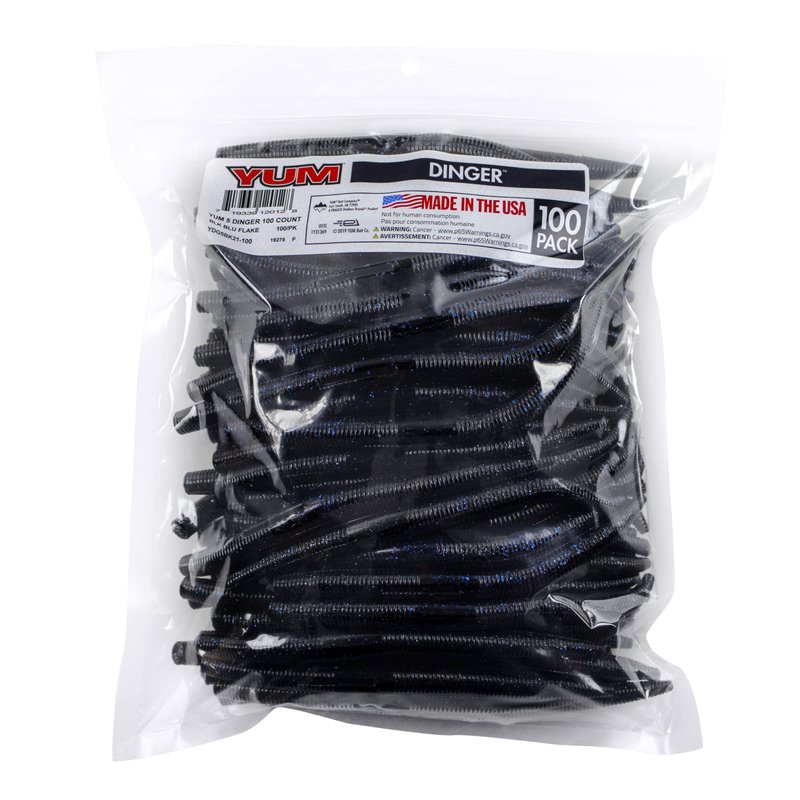 Yum Dinger Classic Worm All-Purpose Soft Plastic Bass Fishing Lure 100 Pack, Black Blue Flake, 5 Inch