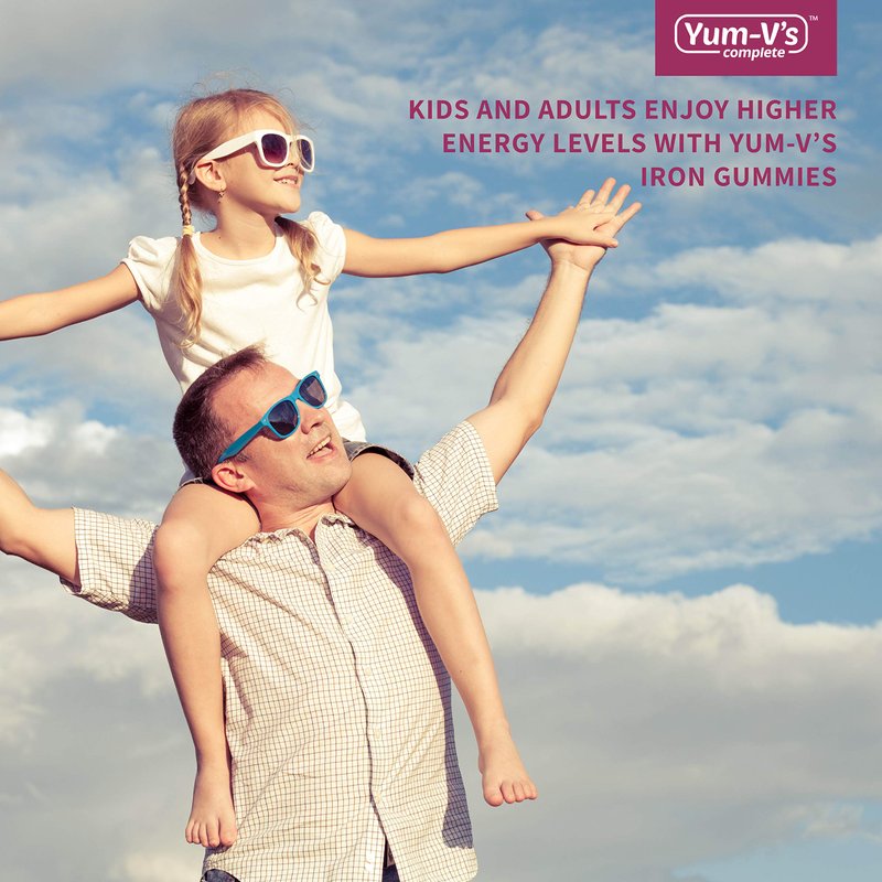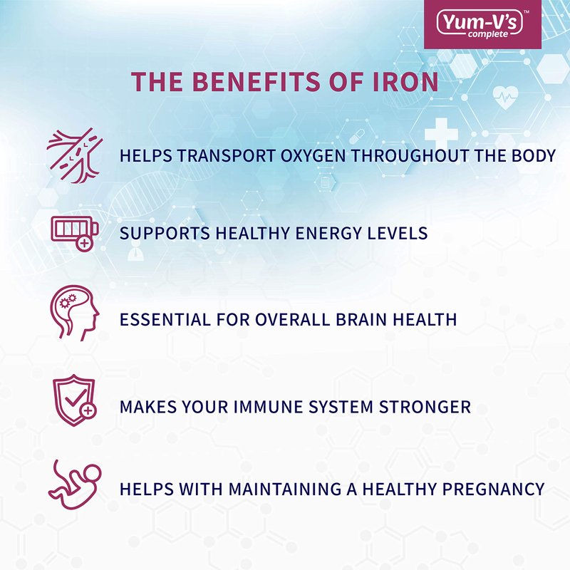 - YUM-V's Complete Iron with Vitamin C Jellies for Adults, Grape Flavor (60 count). Each serving contains 10mg of Iron and 40mg of Vitamin C to help with absorption. Supports red blood cell formation and energy levels.