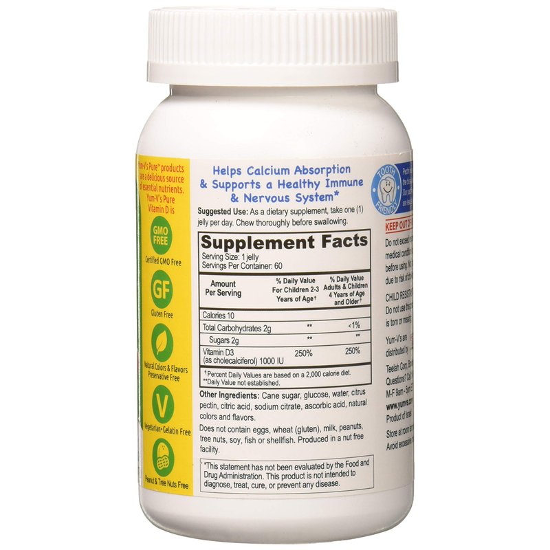 - YUM-V'sVitamin D (1000 IU) Chewable Jellies (Gummies) for Kids, Yummy Berry Flavor (60 Ct); Daily Dietary Supplement with Essential Vitamins – Kosher, Halal, Gluten Free Children’s Vitamins