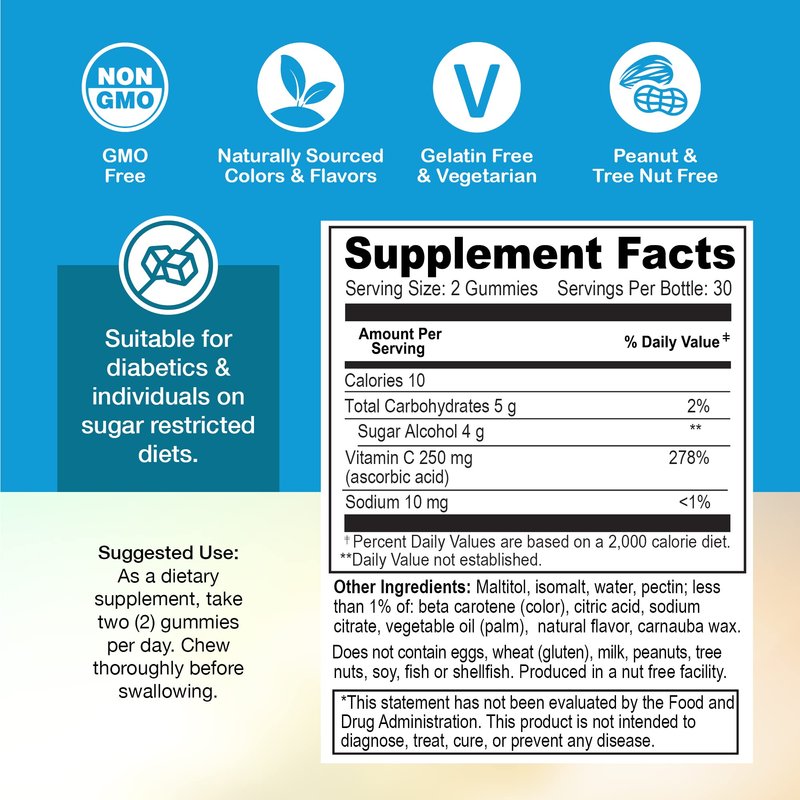 - DELICIOUS VITAMIN C BOOST - Enjoy 250mg of Vitamin C in each tasty orange flavored sugar free gummy. Vitamin C is an essential vitamin and potent antioxidant that plays a role in many systems of the body.