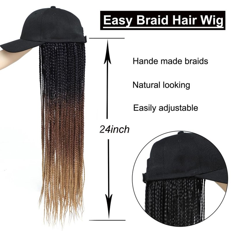 - FEATURES: Baseball cap with 3X full braids hair extensions, 60 roots box braids, no twist.