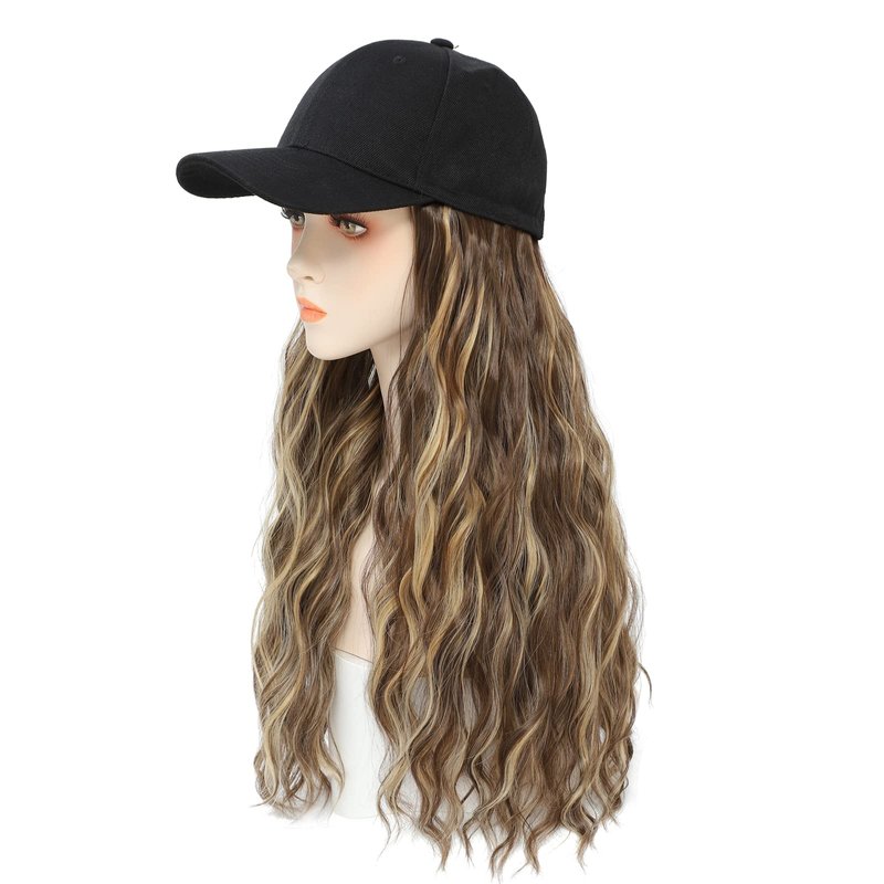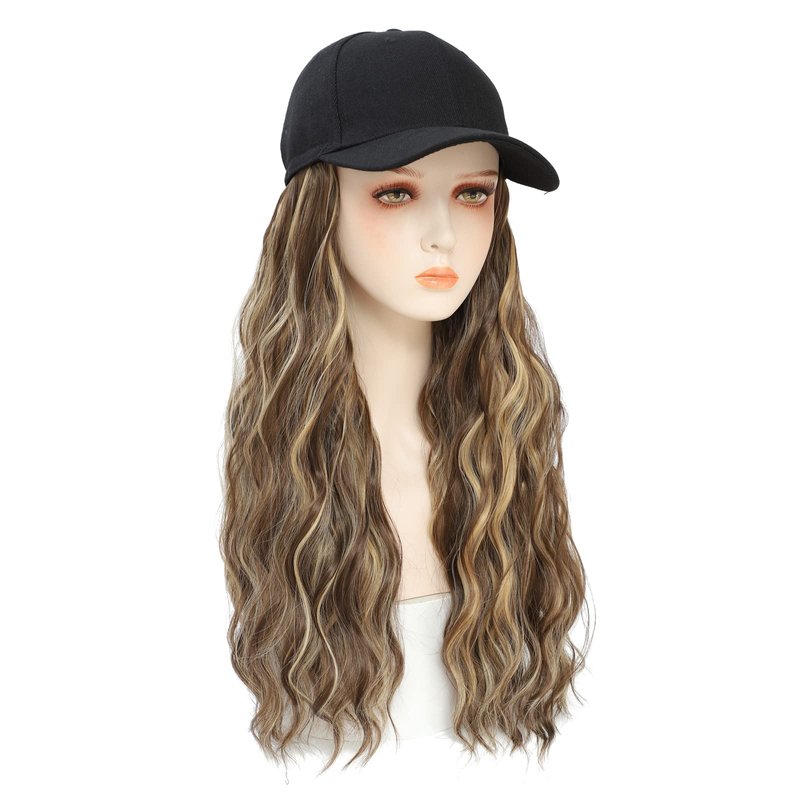 Yunkang Baseball Cap Wig Long Natural Wavy Hair Extensions With Hat Heat Resistant Synthetic Fiber Extensions Adjustable Hat Wig for Women Girls (B-M Brown blonde)