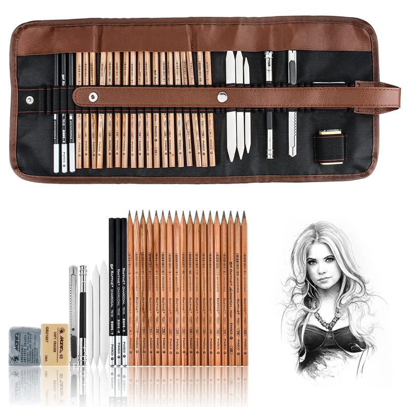 - 【Premium Quality & Eco-friendly】Adopt eco-friendly material, provide a protection for your health. Durable art knife + Portable and dirt-resistant canvas roll bag + Premium sketch Pencils + Exquisite Metal double-end pencil extender.
