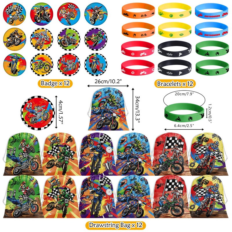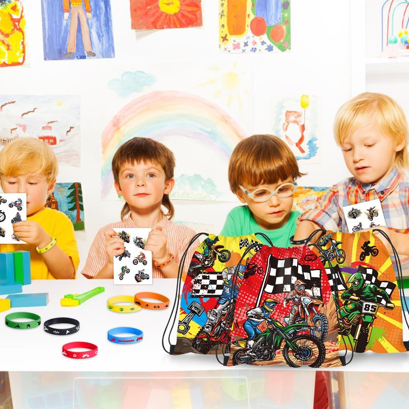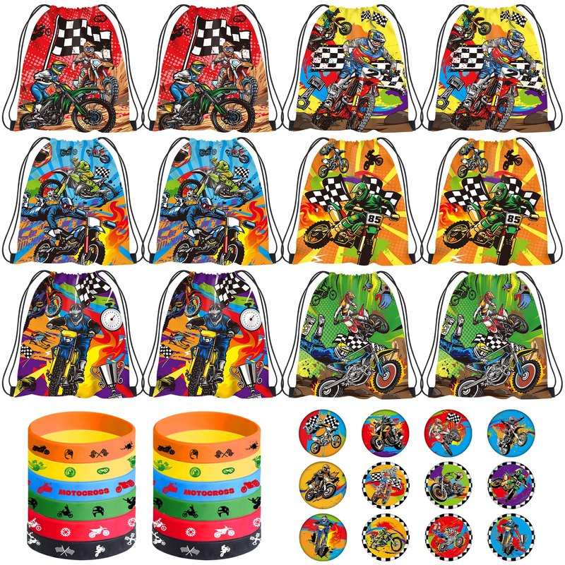 Ywediim Dirt Bike Party Favor Supplies, Including Motorcycle Theme Boy Motocross Bags Drawstring Goodie Treat Bags Wristbands Badge, for Motocross Theme Kids Birthday Party Gift
