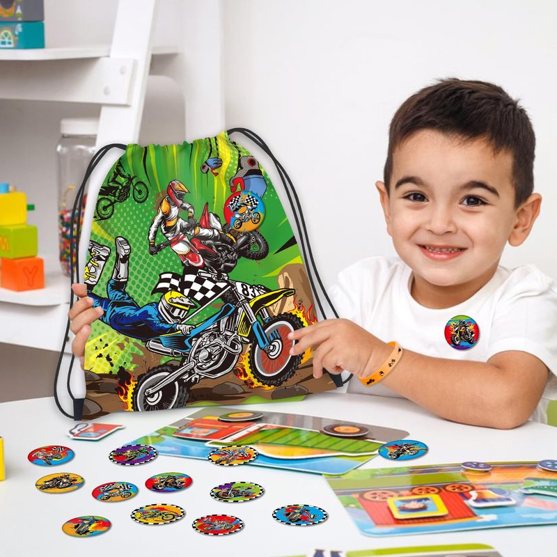 - Super Value Kids Construction Gifts Set: Includes 12 wristbands, 12 dirt bike theme button badges, 16 dirt bike theme Drawstring Party Bags 10*13 Inch, 6 Styles, which is enough for kids to share with others to have fun, and you can pack these in the party bags as giveaways for guests.