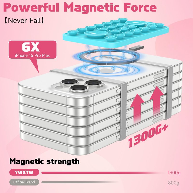 - Rock-solid Suction: Back of phone suction grip adopts an upgraded large suction cup, more sturdy and thick. The suction phone grip uses vacuum negative pressure to generate strong suction force, and the suitable contact area provides more reliable support, so it sticks well to smooth surfaces without slipping or shifting. Built-in ultra wide magnet in the mount can support a weight of 1300g, equivalent to the weight of 6 iPhone 16 Pro Max, ensuring a safe and durable connection.