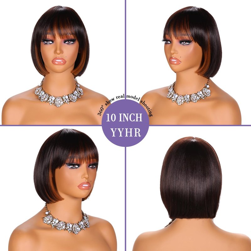 YYHR Short Bob Wig With Bangs 10" Peek-a-boo Dark brown Mix Light brown Bob Wigs Yaki Straight Hair Daily Costume Wig, Soft Light Synthetic Hair Replacement Wigs (10 Inch,S4/30)