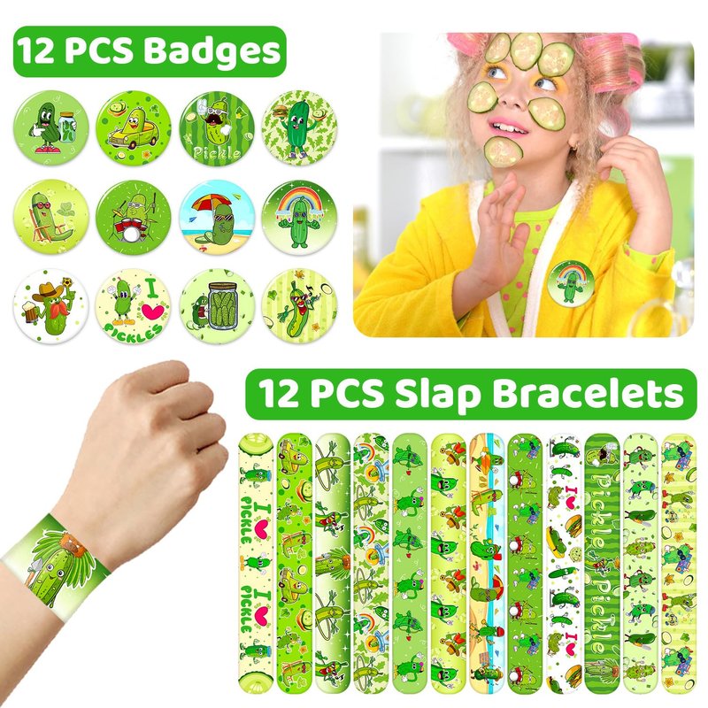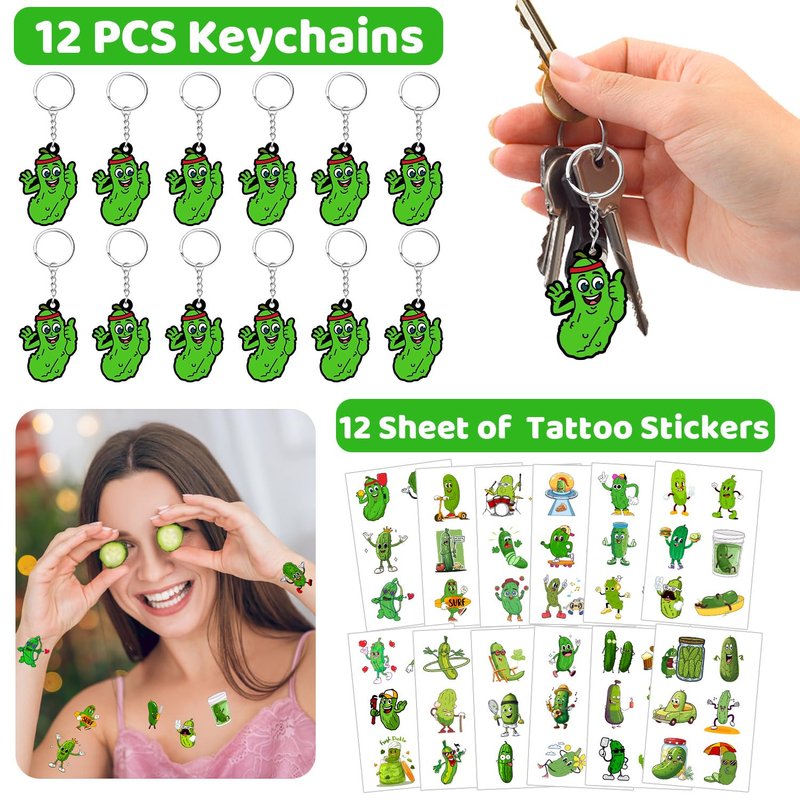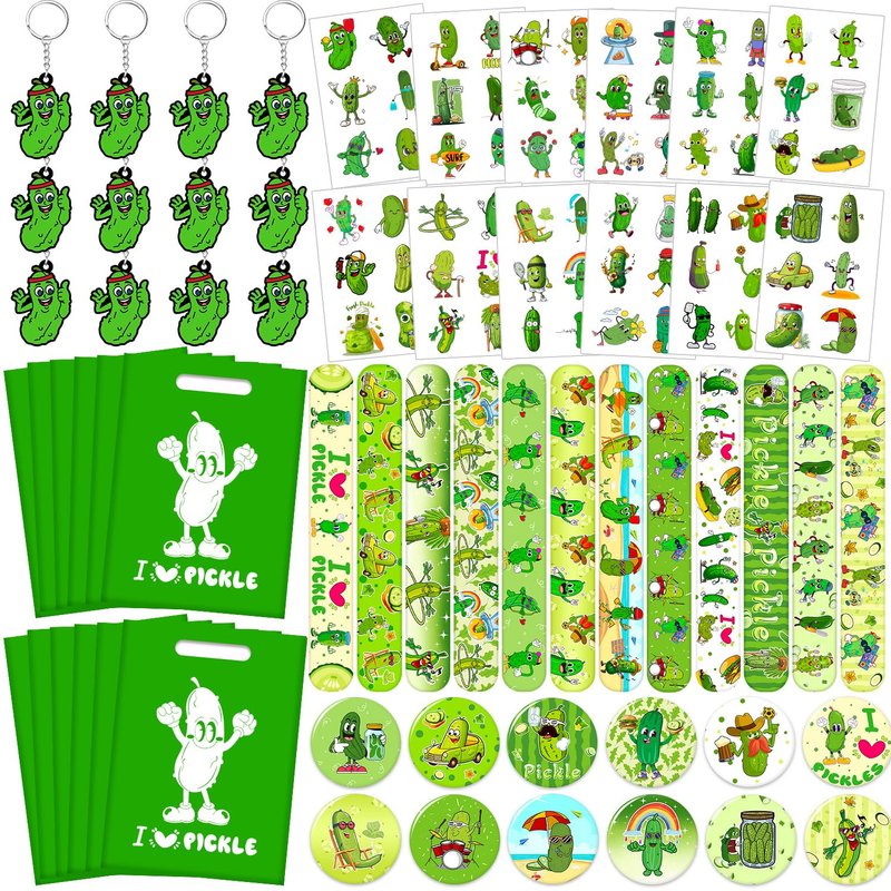 - Pickle Party Favors: Our package includes contain 12 sheet pickle temporary tattoos, 12 pcs pickle slap bracelets, 12 pcs pickle badges, 12 pcs pickle keychains, 12 pcs pickle gift bags, Enough quantity to meet your pickle party needs