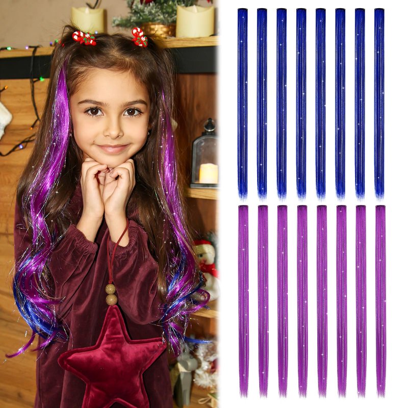 - 8 pieces of clip in purple tinsel hair extensions and 8 pieces of blue hair extensions with silver tinsels are nicely packed in a bag, 16 pieces in total. It can be an amazing Christmas stocking stuffer for your kid or friend for any special days, such as Halloween, Christmas, crazy hair day, birthday party, etc.