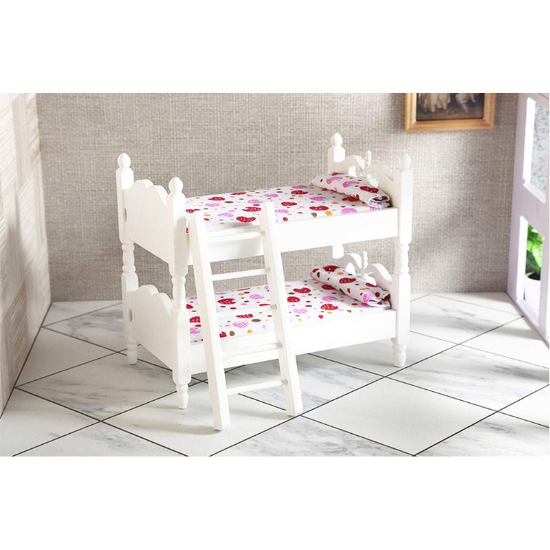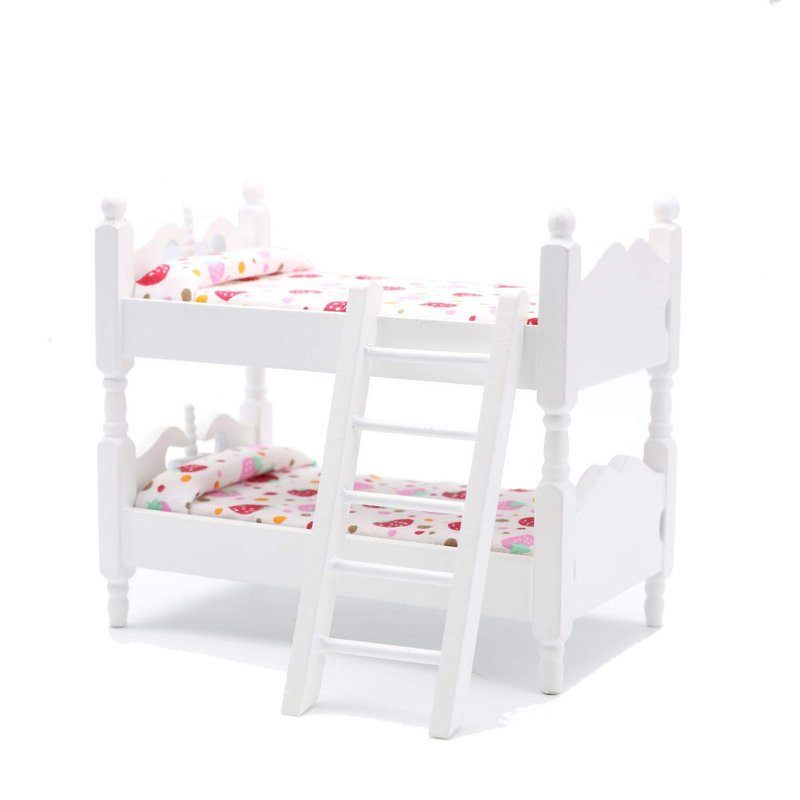 Baby bunk bed is made by quality wood, design as cute cartoon cotton cloth with removable ladder, cute, sturdy and durable for years. Wood bunk bed is perfect size for all kinds styles of baby room, doll houses and house model. Light enough for carry, it's a great learning toys for your kids to play house.