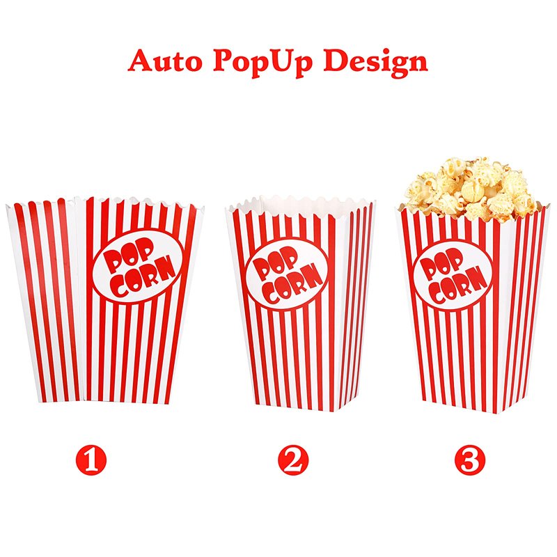 - Easy-to-Fold Design - Our cardboard popcorn buckets feature a special bottom-folding technology that makes them compact when not in use. Simply push on the diagonal corners; the bags of popcorn will automatically unlock and open in no time