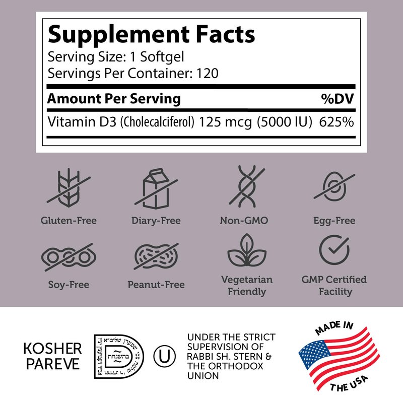 - ADVANCED VITAMIN D3 - Each 5000 IU Vit D3 softgel (125 mcg) is easy to swallow as part of your daily health and wellness routine. Looking for a different daily value of D3? We offer 6 different serving sizes to help support bone health, teeth health, muscle health and immune support.